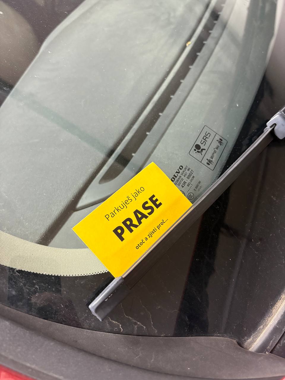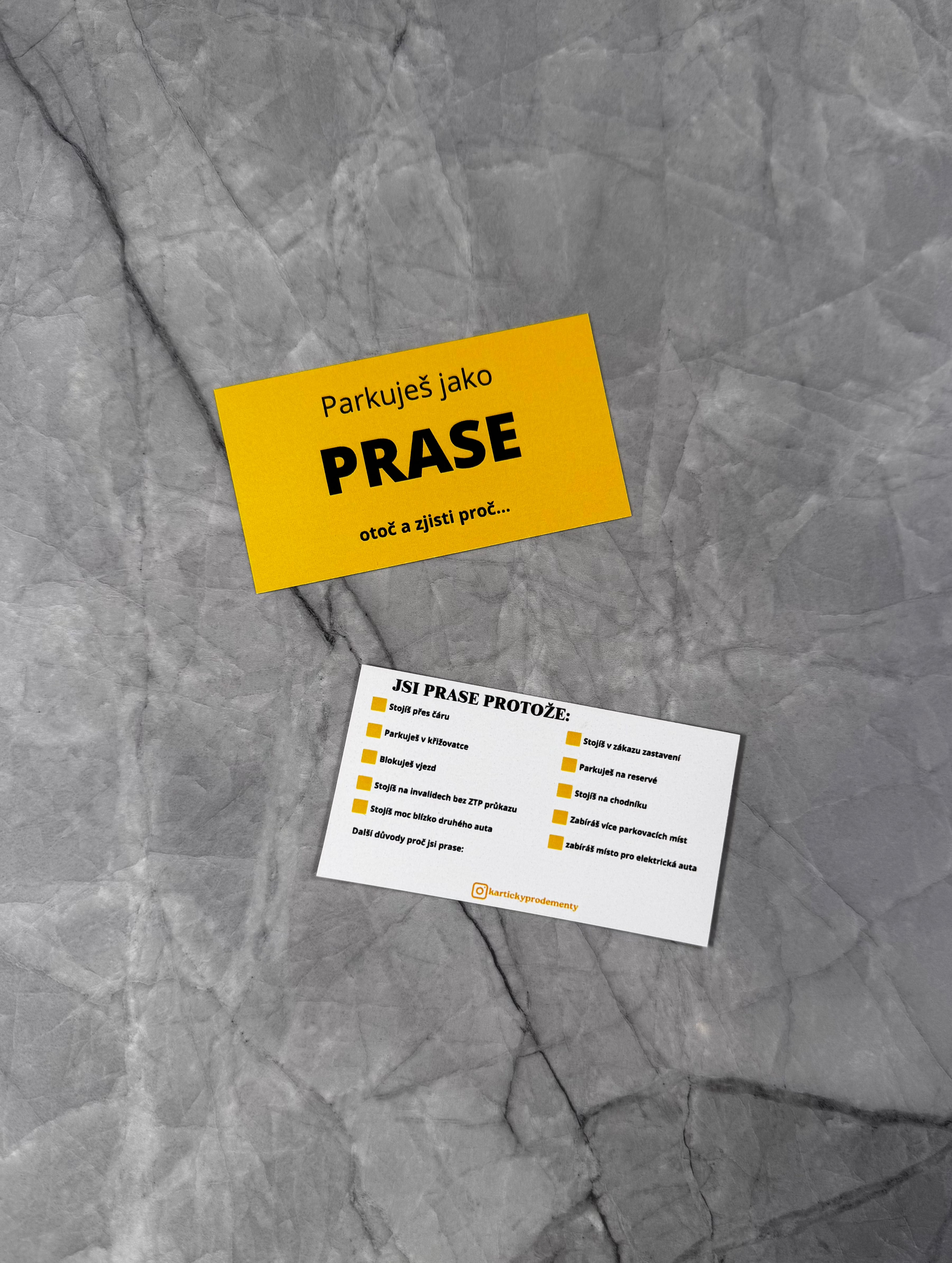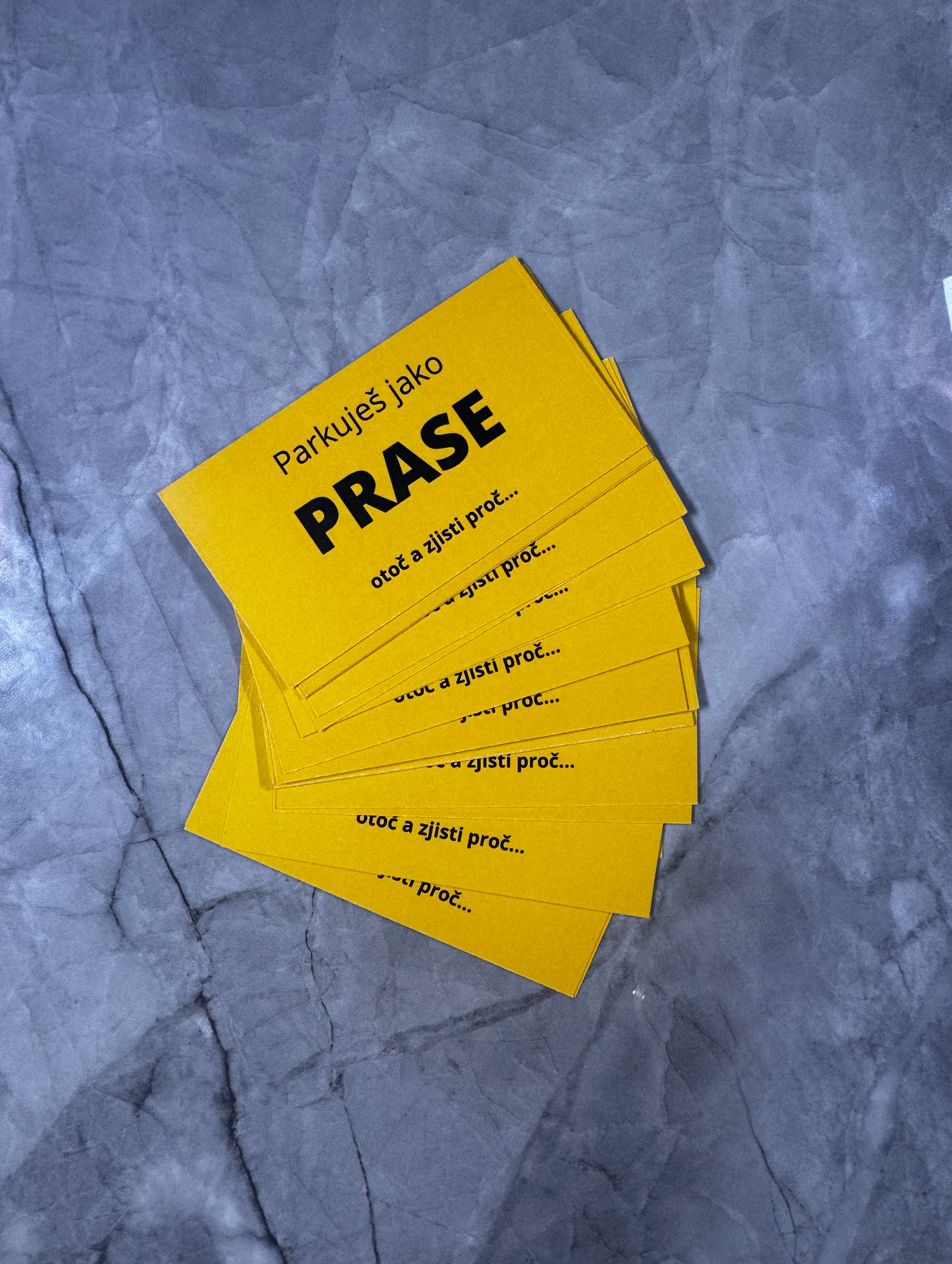 Přední strana? Jednoduchá a nekompromisní: „Parkuješ jako PRASE – otoč a zjisti proč…”